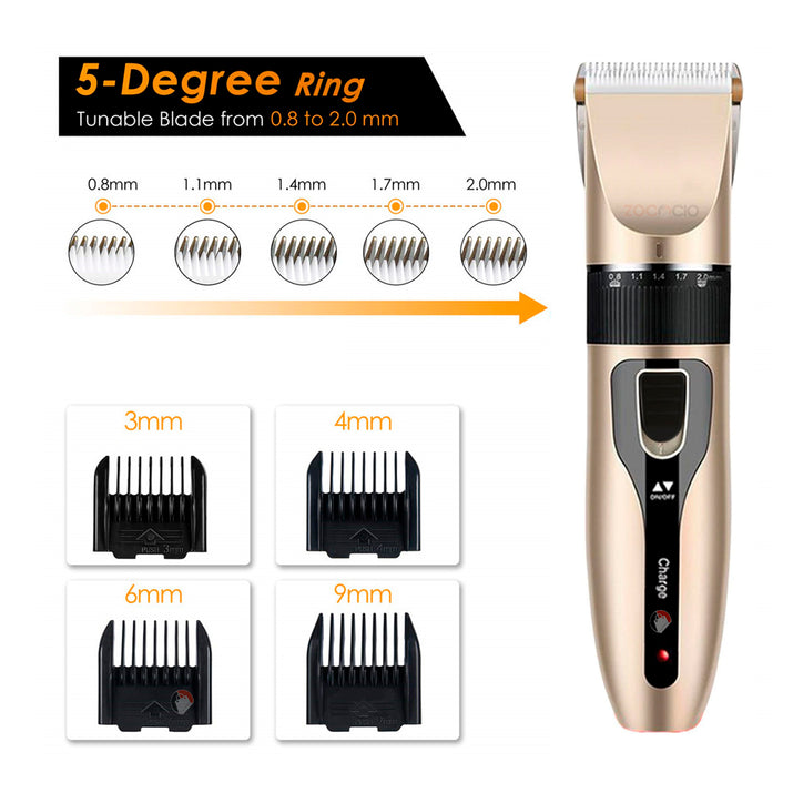Respuesta 3: El kit incluye 4 peines guía (3, 6, 9 y 12 mm) y un selector de precisión (0.8 a 2.0 mm) que te da control total sobre el largo del pelo, adaptándose a cualquier raza y estilo.